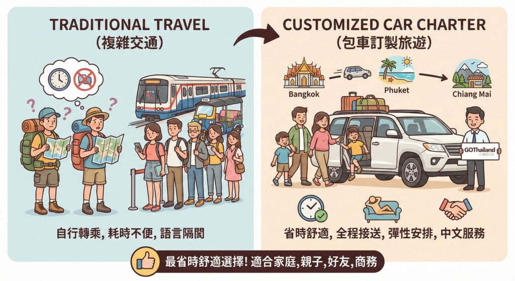 泰國包車訂製旅遊是前往曼谷、芭達雅、清邁、普吉島等熱門城市時,最省時又舒適的交通與行程安排方式。透過司機+中文導遊的雙服務配置,一次解決交通動線複雜與語言溝通不便兩大問題,特別適合家庭旅遊、親子同行、好友出遊或商務行程。