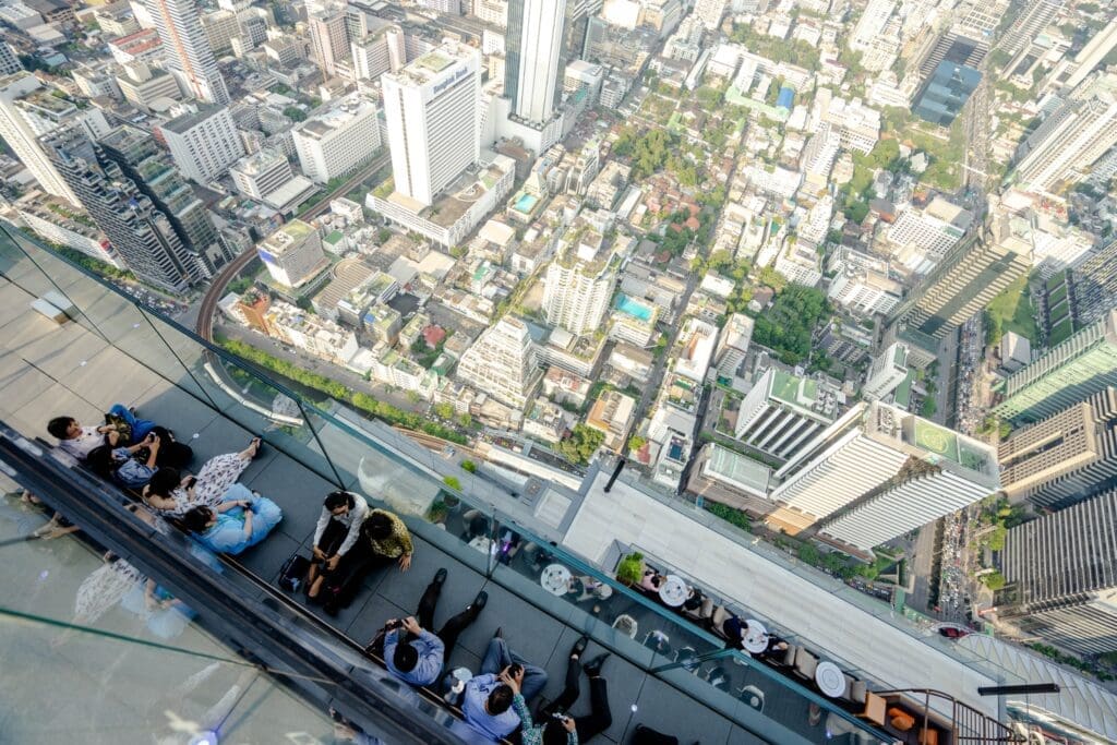 王權雲頂大廈是一座高達314米的摩天大樓,擁有78層樓,是曼谷市區的一道獨特風景線。而玻璃觀景台是這座大樓最矚目的景點之一,從這裡你可以俯瞰整個曼谷市區的美景,包括附近的曼谷王朝廣場和素坤逸大道。