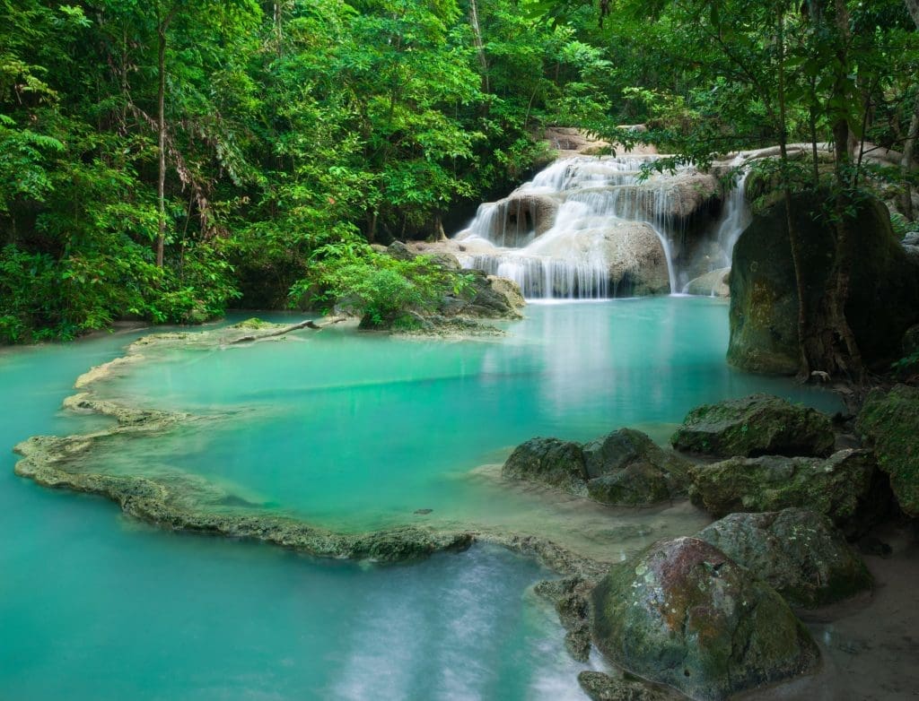 愛侶灣位於泰國北碧省,是一個地質奇觀的代表。這片地區的主要地質為石灰岩,這種岩石易受風化和侵蝕,形成了許多突出的岩壁和深淵。隨著時間的推移,雨水和溪流在石灰岩上形成了許多溶洞和瀑布,其中愛侶灣的七層瀑布就是最突出的例子之一。