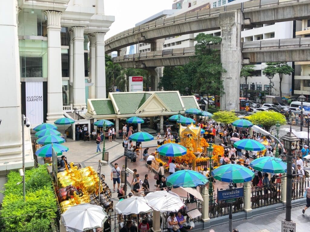 在四面佛前,您可以購買和供奉香燭、花卉和金箔。信徒們相信將金箔貼在佛像上,可以帶來好運和財富。四面佛周圍也有許多攤販,出售各種泰國紀念品和食品,如水果、小吃和手工藝品。