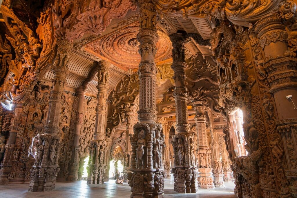 真理寺是由純紅木和柚木建造而成,展現了人與天地宇宙間的關係,以及泰國精湛的木雕工藝。這座寺廟的建築風格以亞洲傳統藝術風格和泰國曼谷王朝的華美風格為主,非常壯觀。