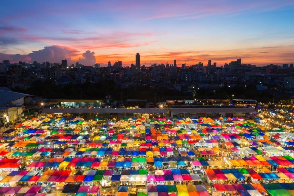 亮點:超過1200個攤位,主打美食和小吃,比如火山排骨🌋和網紅水果西施,還有手工藝品、民族服飾等,應有盡有,逛一晚都不夠! - 交通建議:搭地鐵藍線在 Phra Ram 9站 下車,從2號出口進入商場後上一層,從後門出來即可到達。