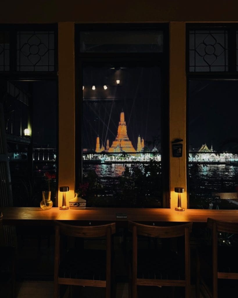 店內的靠窗座位直接面向鄭王廟,特別是在日落時分,夕陽餘暉灑在鄭王廟的金頂上,美得讓人屏息。店內的「Before Sunset」主題氛圍與窗外景致相得益彰,是曼谷拍照打卡的最佳選擇!