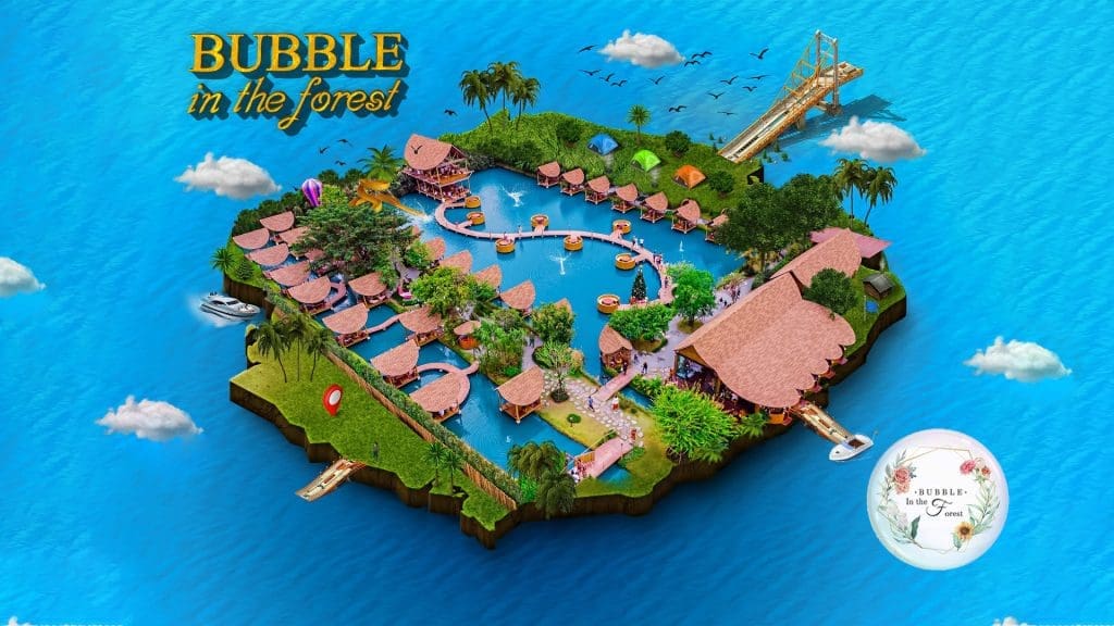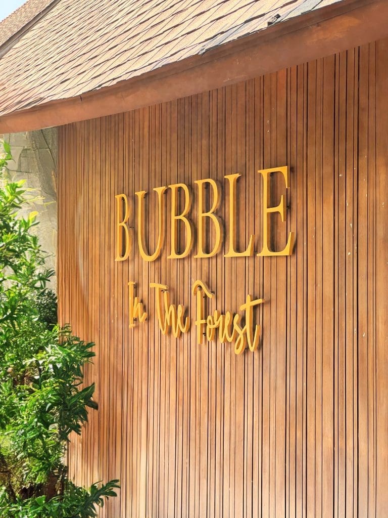 一進入 Bubble in the Forest Cafe,您會被入口處的皇后座椅和大招牌吸引,這裡是拍照的最佳地點之一。內部環境分為室內和戶外座位區,室內座位有冷氣但數量有限,戶外則有不同的景觀區域,包括著名的木棧道和藍色的海水池。