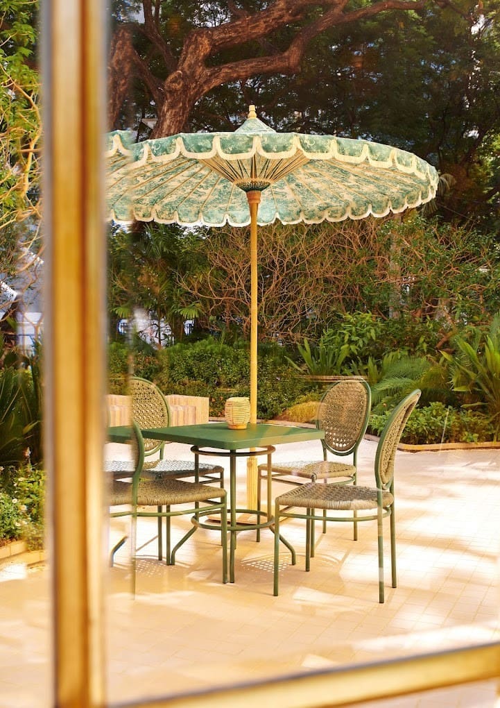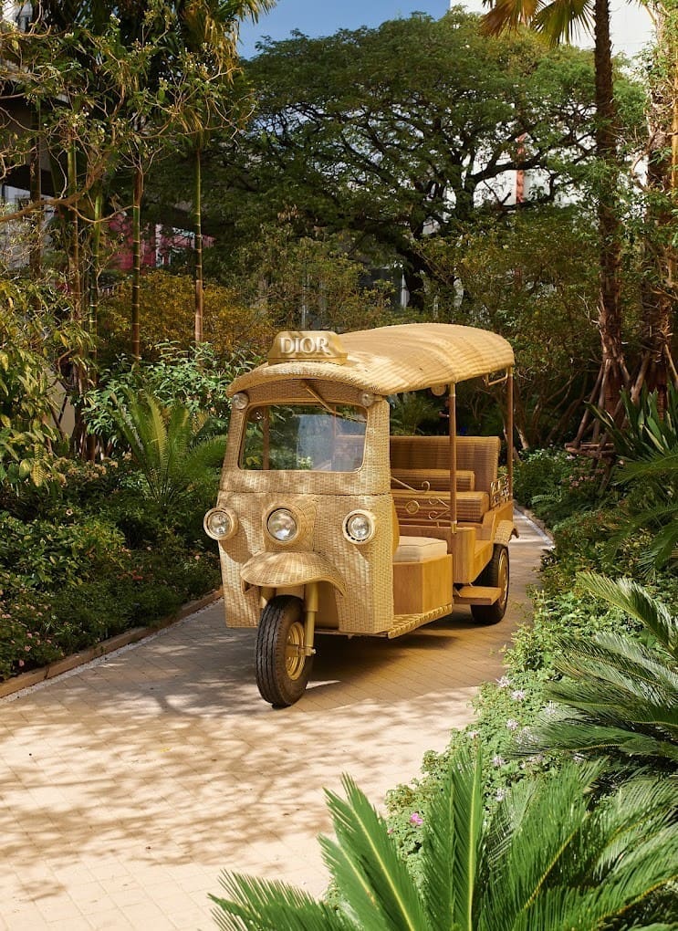 黃金屋內還設有一座Dior咖啡館,是結合法式精緻與泰式風情的美食空間。內部裝潢以竹藤材料為主,外部花園則被泰國本地植物環繞,營造出一種自然與奢華並存的氛圍。