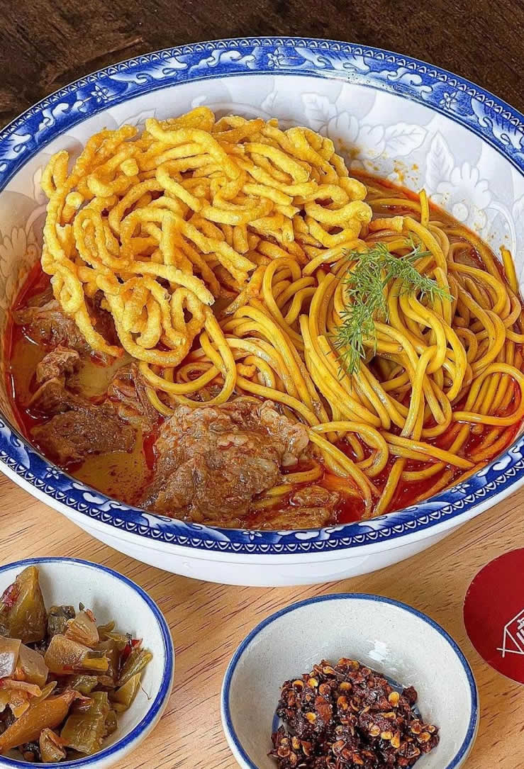 - 咖哩湯底濃郁中帶著微辣,搭配酥炸麵條與醃菜,每一口都香到讓人感動
