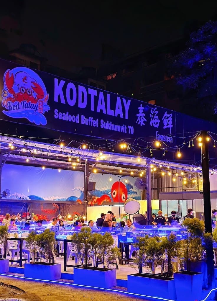 如果你們是海鮮控,那我推薦你們一定要去Kodtalay Seafood Buffet。這可是曼谷最火的海鮮自助餐之一啊!499泰銖的價格就能讓你不限時地大吃特吃各種新鮮海鮮,比如蝦、螃蟹,還有生腌海鮮。而且這裡交通很方便,就在BTS Udom Suk 4號出口附近。環境呢,是路邊廠棚的那種,別看簡單,但非常乾淨衛生。