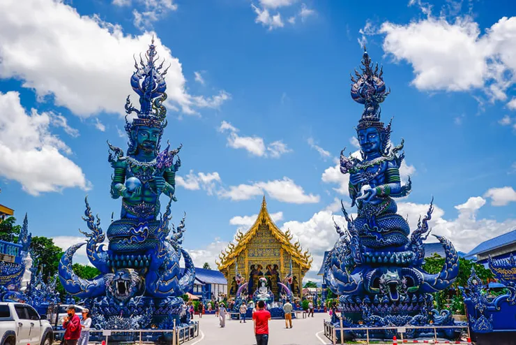 以夢幻藍色為主體設計,融合傳統與現代藝術,內部金光閃閃的佛像與壁畫令人驚艷。是清萊新興的必訪寺廟之一。