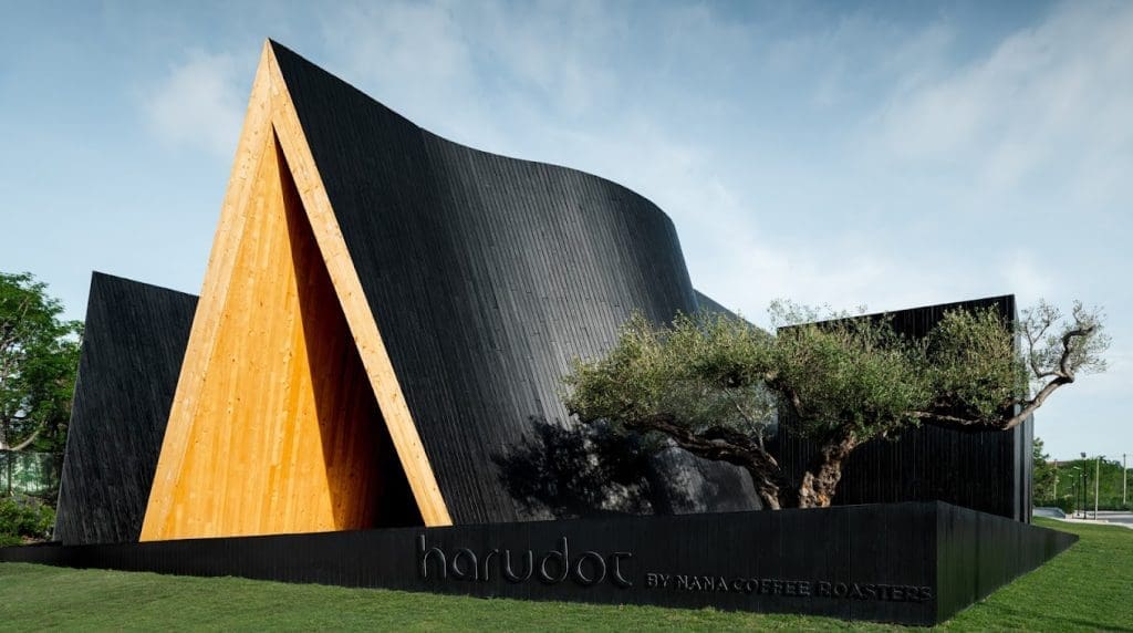 主打【黑棕色系】的Harudot,曾榮獲【最佳設計獎】!店內區分為室內外空間,有瀑布、花園以及室內巨樹🌳,處處都是生命力的象徵。