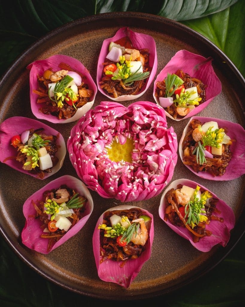 如果你喜歡特別的泰國菜,一定要試試這道 花瓣沙拉!它不僅 顏值超高,還結合了 香濃的椰奶、花生醬與新鮮花瓣,口感清爽又帶點甜味,是一道 超級特別的泰式前菜,拍照打卡也很吸睛!📸