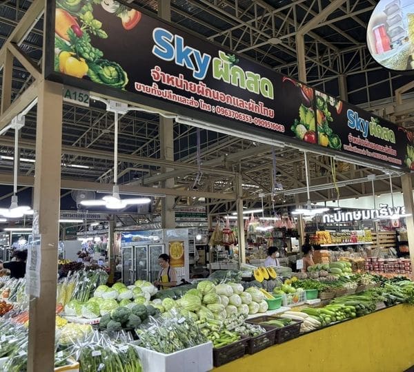 蔬菜區則提供了各種新鮮的蔬菜和綠葉菜,包括泰國當地特色的香草和調味料,如羅勒、薄荷、香茅等,為你的廚房增添更多選擇。這裡的攤位整齊有序,產品擺放得井然有序,顏色鮮豔的蔬菜和水果讓整個市場顯得格外生機勃勃。