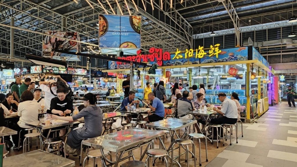 你可以在這裡品嘗到現做的海鮮料理、香辣的泰國菜、清爽的水果沙拉以及各種美味的小吃。無論是愛吃辣的遊客,還是偏好清淡口味的朋友,都能在這裡找到合適的食物。坐在舒適的座位上,品嚐著美食,欣賞著市場的熱鬧景象,這種體驗無疑是非常愜意的。
