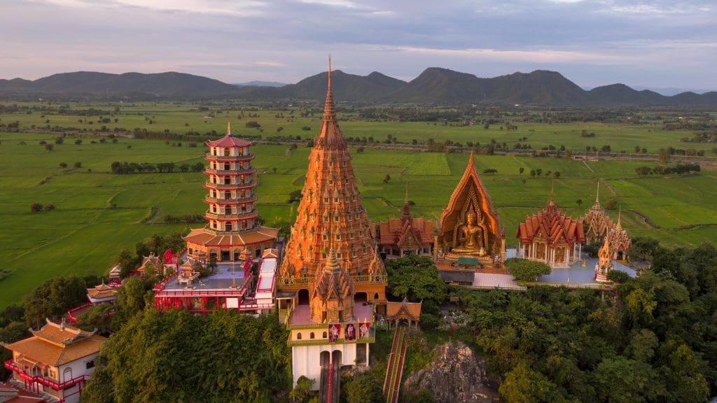 北碧府的虎穴寺(Wat Tham Sua)的名字意為“有老虎洞穴的寺廟”,這裡融合了泰國、中國和印度的建築風格,是一個充滿歷史、文化和宗教意義的地方。