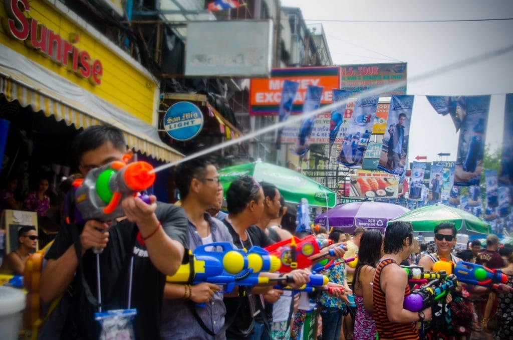考山路被稱為背包客的天堂,是來到曼谷的外國遊客聚集地。在潑水節期間,考山路成為遊客們夢寐以求的「潑水一級戰區」。這條街區雖然不長,但在潑水節期間卻擠滿了歡笑聲和水花四濺的景象。外國遊客、泰國年輕人、當地商家全都熱情參與,不論你是拿著水槍的初學者,還是全副武裝的潑水老手,進入考山路後你會發現,想要保持乾燥的衣服根本是異想天開!